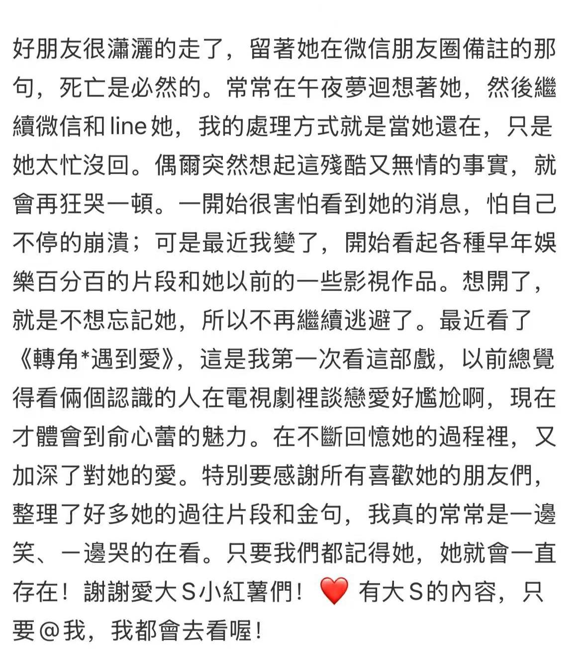 大S離世後,妹妹小S也說過同樣的話,她希望大家不要忘記大S,用力想念她,才是對她最好的悼念方式。