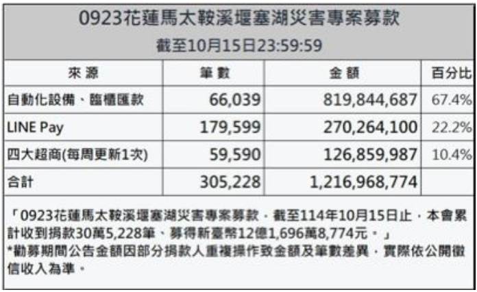 賑災基金會今日傍晚發布新聞資訊,表示9月25日啟動「0923花蓮馬太鞍溪堰塞湖災害專案募款」,統計至今日募得款項12億餘元,總筆數超過30萬筆。目前第一階段慰助金已陸續發放中,第二階段生活支持與關懷照護相關作業亦迅速啟動。