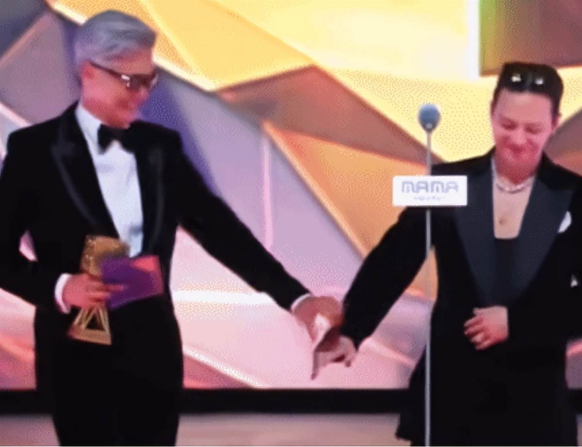 默哀後他正常主持,在和韓國明星權志龍上臺時,他還和這個十年前的獲獎者互動,兩人還在臺上默契舞動了一下,化解了一下這沉重的氣氛。