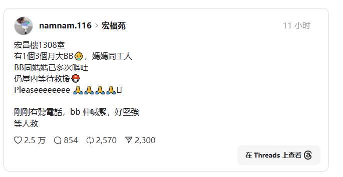 據《有線新聞》報導,大埔宏福苑有多人受困,其中有一對母嬰及工人,嬰兒月齡僅3個月大,3人被困在宏昌閣1308室。母親的朋友在社交平臺幫忙求救,指嬰兒與母親已經嘔吐多次,電話那頭還傳來嬰兒大聲哭喊的聲音。所幸深夜傳出好消息,受困3人均已獲救。