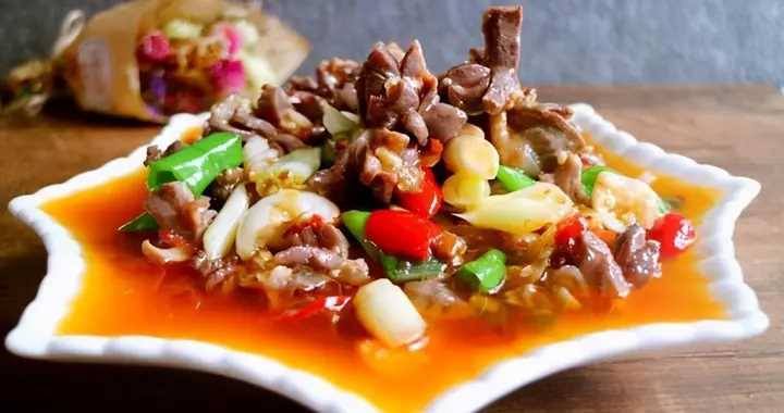 食材:鴨胗、大蔥、郫縣豆瓣醬、花椒粒、泡姜、泡紅辣椒、大蒜、白酒、美人椒、紅薯粉