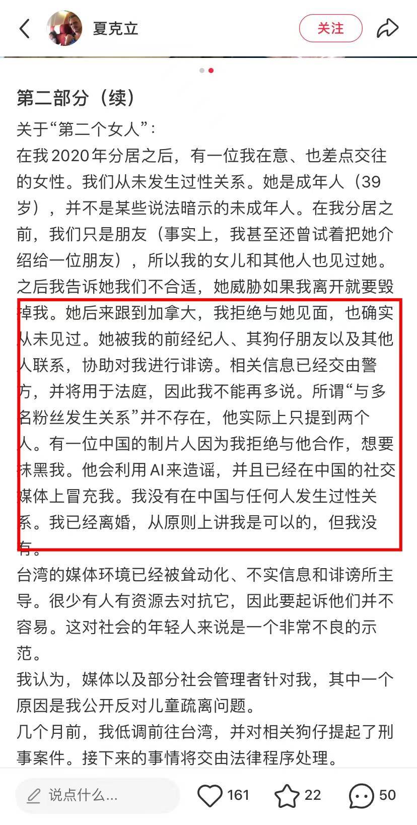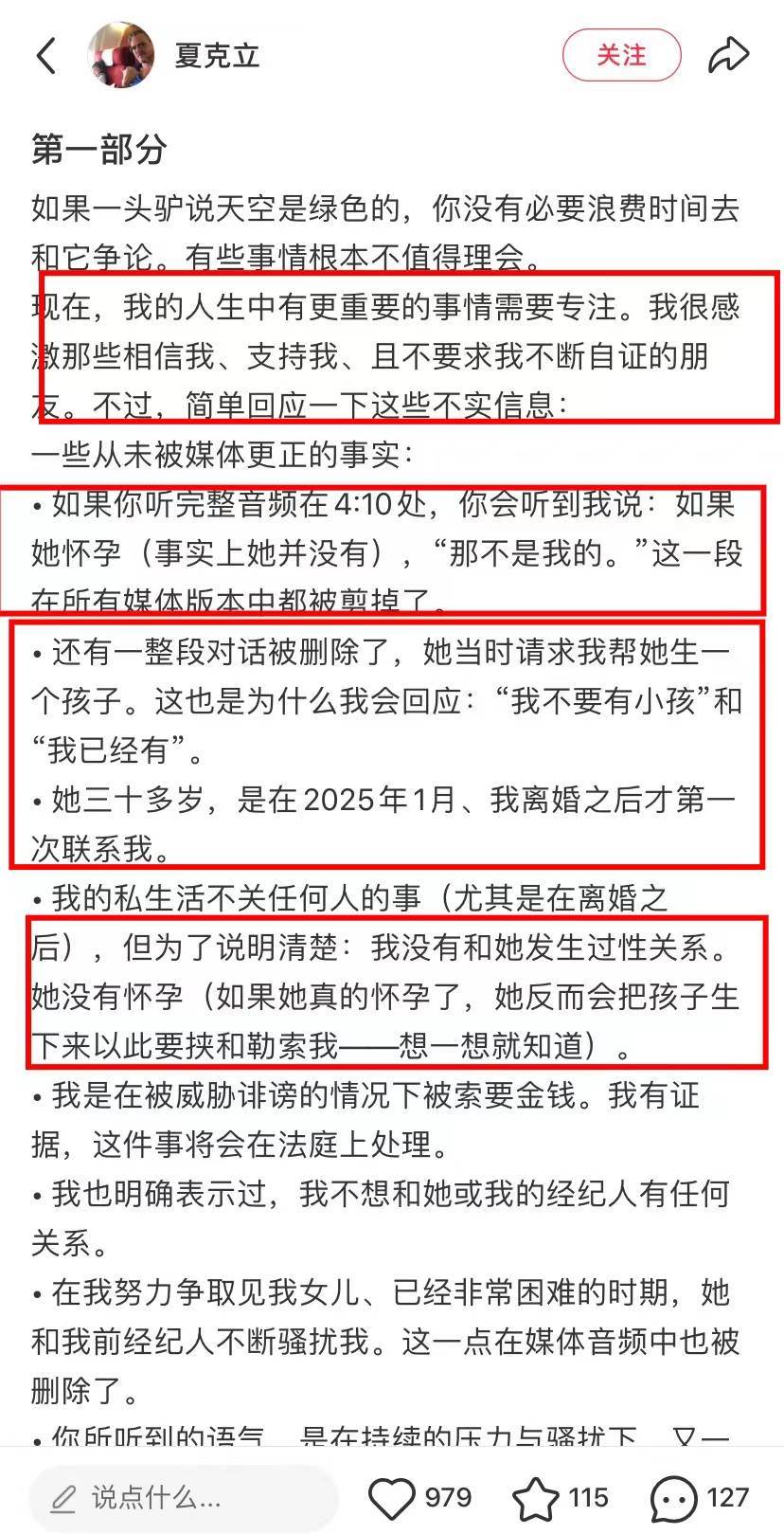 夏克立在社群賬號發文否認睡粉,還表示洩露的錄音其實被剪輯過,事實上這位粉絲並沒有懷孕。