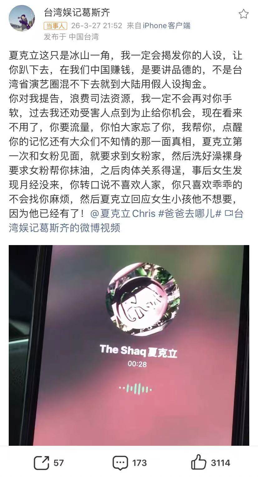 台灣狗仔葛斯齊爆料加拿大籍藝人夏克立睡了女兒夏天的粉絲,導致其懷孕。