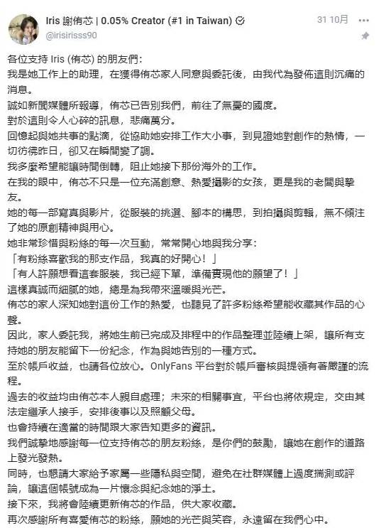 助理強調,OnlyFans 資金提領流程嚴謹,過去收益皆由謝侑芯本人管理,後續賬務將依法定繼承程式處理,用于後事及照顧家人。同時呼籲外界停止過度揣測,尊重逝者與家屬,「希望賬號成為紀念她的地方,而非新的輿論戰場」。