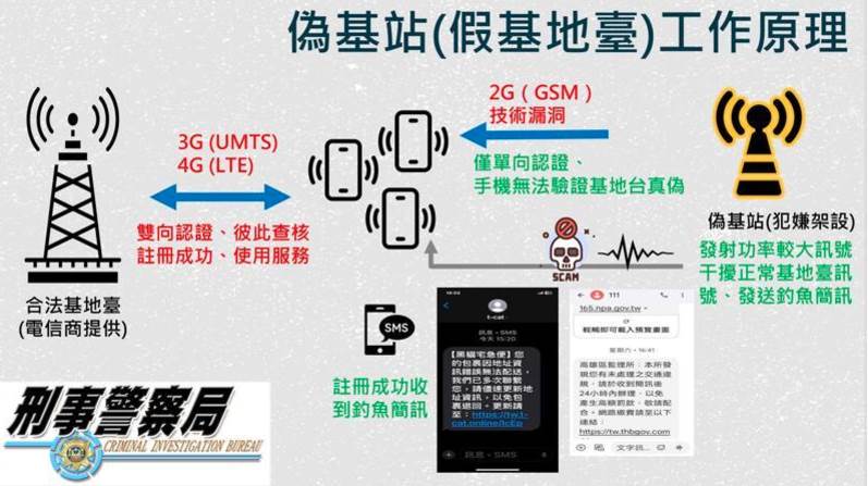刑事局電偵大隊曾逮獲一名32歲郭姓男子,發現他購買了陸製假基地臺電信裝置,該機器只要一經啟用,便無須支付簡訊費用,可大量向民眾傳送釣魚簡訊,從而傳送「eTag自動扣款失敗、玉山銀行網路已暫停」等釣魚簡訊,藉此誘騙民眾透露個資與信用卡資料後盜刷。警方循線將郭男逮捕到案,主管單位NCC也依據《電信管理法》對郭男開罰400萬元,成為我國首宗假基地臺詐騙案例。